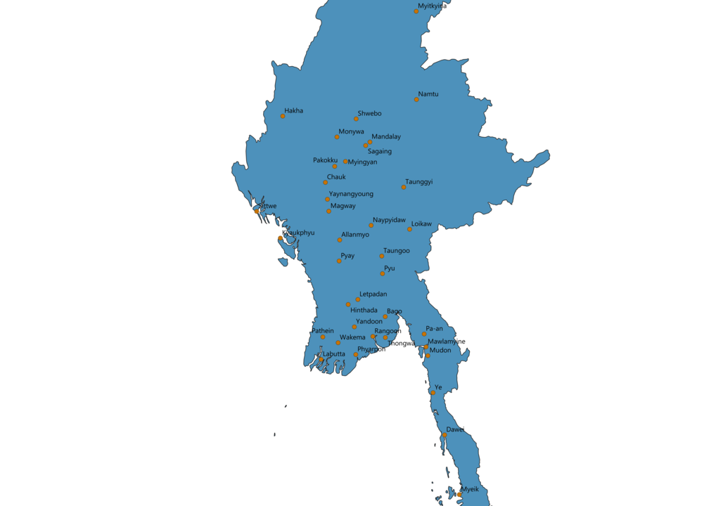 The image shows the main cities of Myanmar to help you find the destination of your trip.
